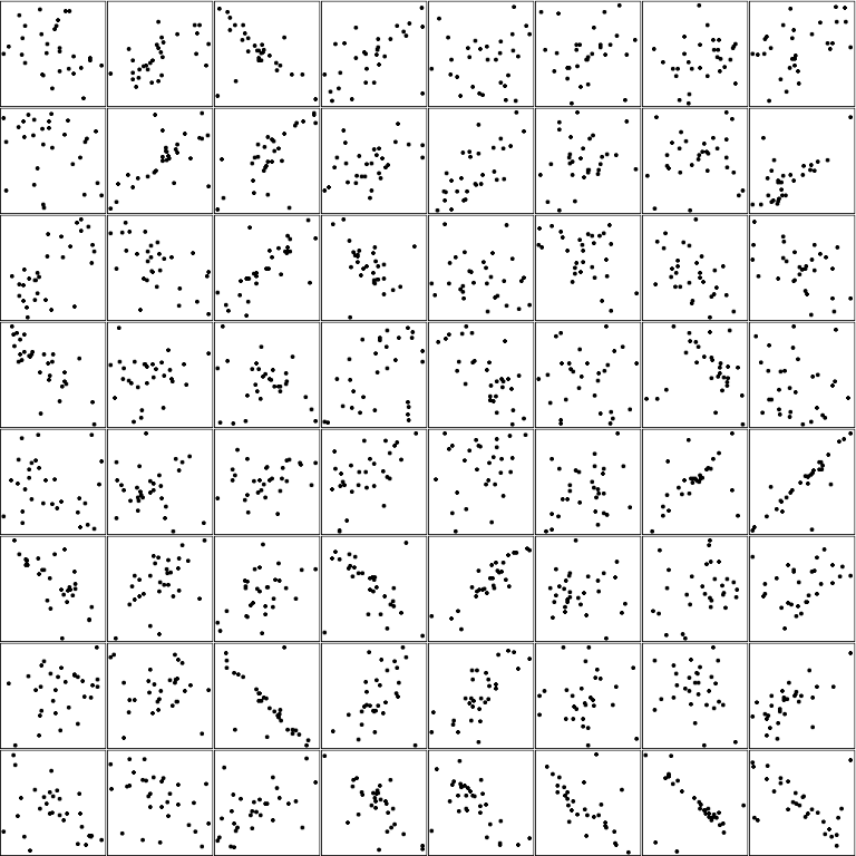 “Guess the correlation” is a fun dataset that tasks one – a person, if they feel like, or a program, if we train it – to estimate the (linear) correlation between two variables displayed in a scatterplot.
